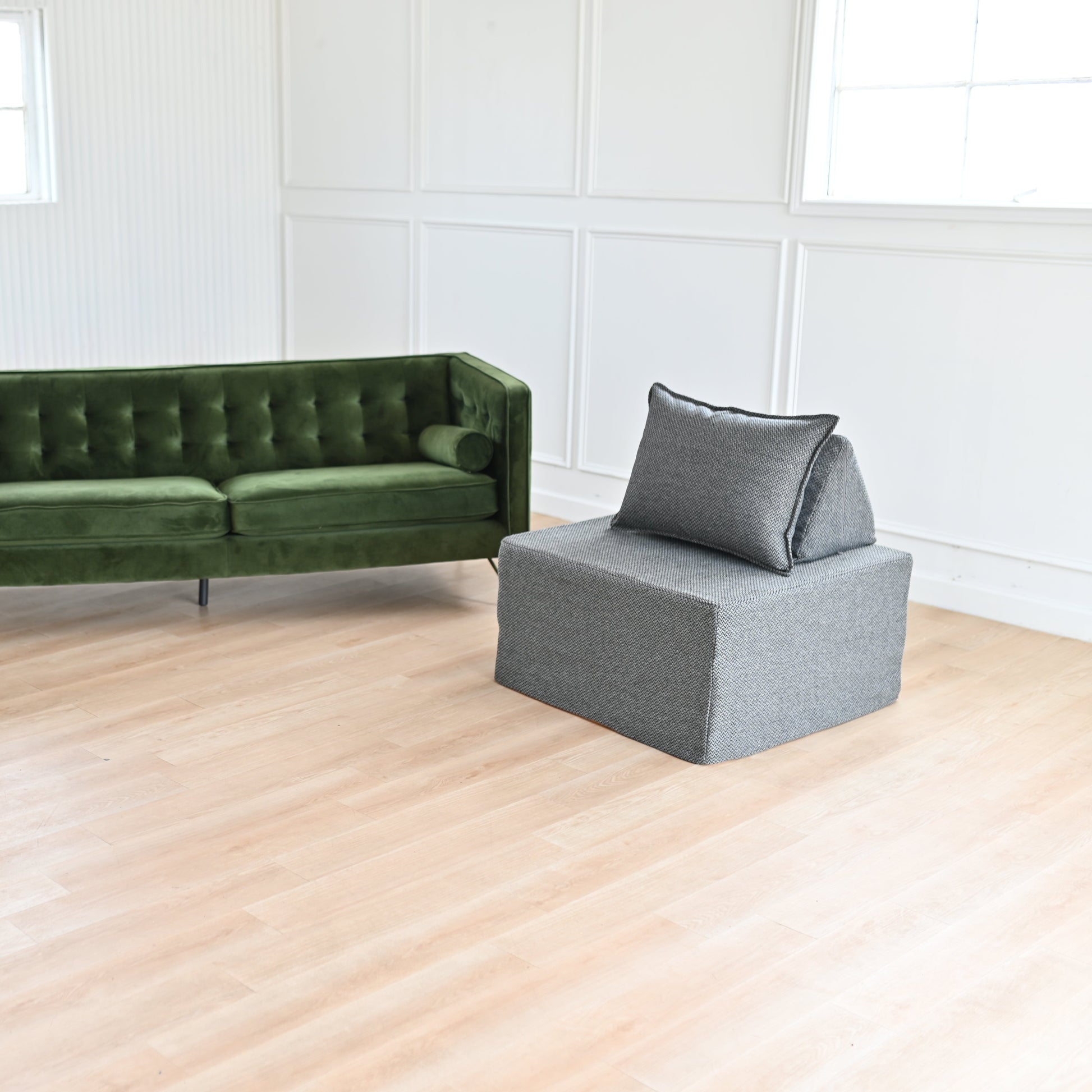 Designed to fit standard modular play couch pieces. This is a set of three covers that easily transform a play couch into a modern chair. High-quality, machine washable upholstery fabric. Easy to slip on and off. Designed by a mom, with style and function in mind.